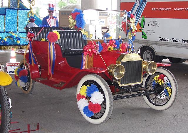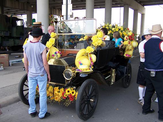 While Model Ts are not the most frequent antique vehicles to be seen in San Antonio's major Fiesta parades, the "Battle of Flowers," the "King William" and the "Flambeau," one or two intrepid owners do brave the rigors of these events. Model Ts, which are not ideally suited for parade work, lacking both water and oil pumps. Ts really need to be going at least 10 MPH to get enough cooling breeze through the radiator. In parades you rarely exceed 2 MPH, and there is a lot of starting and stopping, which only adds to the potential for over-heating. Here are a few snaps of Model Ts in Fiesta parades nonetheless. Some TFOT members are more willing than others to take the risk and do surprisingly well as you can see below.
