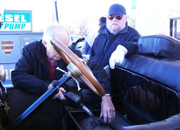 Greg Williams observing George Wilson filling his Model T gas tank on a TFOT tour of Medina County