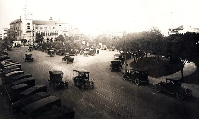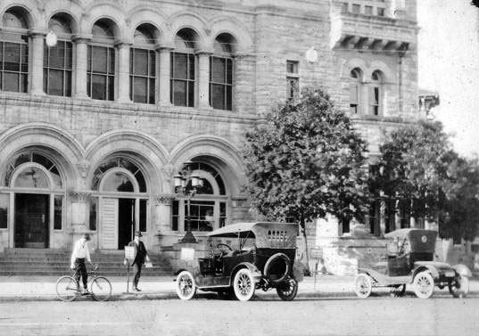 Ford Model Ts at San Antonio post office on Alamo Plaza. This building was soon replaced by the current Federal building