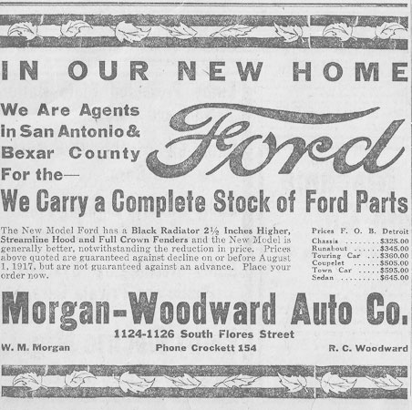 1916 newspaper advertizing the new location of a local San Antonio Ford dealership