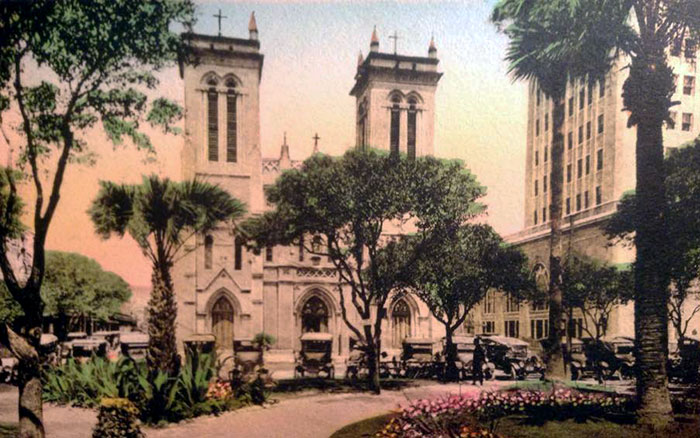 Cars, incuding Model Ts, at San Fernando cathedral in San Antonio, circa 1920
