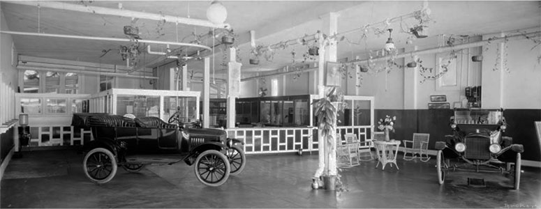 Interior of Herpel-Gillespie Ford's second location for its Ford dealership on East Houston