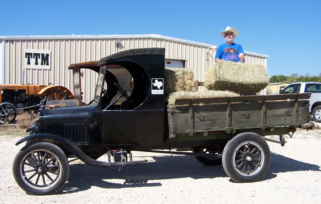 Hugh Hemphill, TFOT Vice-president, loading hay in the 1924 Ford Model T C Cab 1 ton truck belonging to the Texas Transportation Museum
