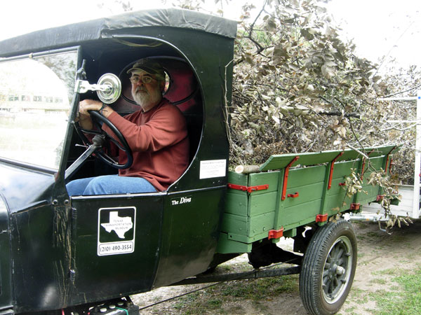 Hugh Hemphill, hauling brush in the 1924 Ford Model T C Cab 1 ton truck belonging to the Texas Transportation Museum