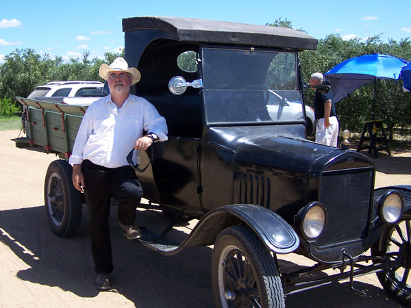 Hugh Hemphill with the 1924 Ford Model T C Cab 1 ton truck belonging to the Texas Transportation Museum at a movie shoot near Carrizo Springs, Texas