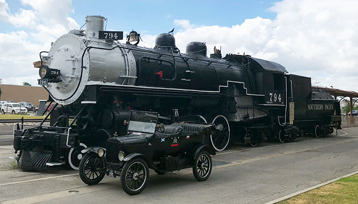 Hugh Hemphill's 1925 Ford Model T with the Union Pacific 4014 "Big Boy and Southern Pacific 794 steam locomtives at Sunset Station, November 2019