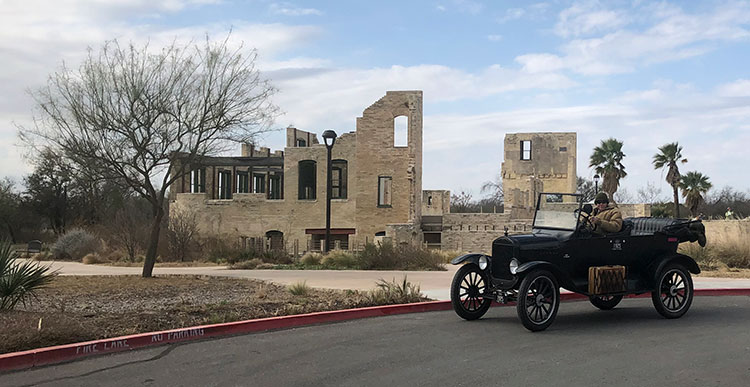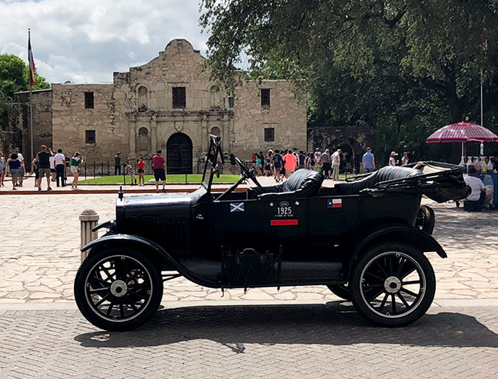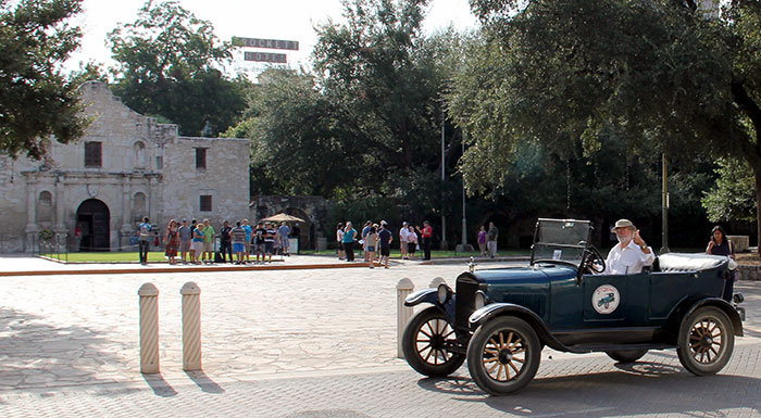Hugh Hemphill at the Alamo in Daniel Bratcher's 1926 Ford Model T touring car during the 2015 San Antonio Ford Model T Show
