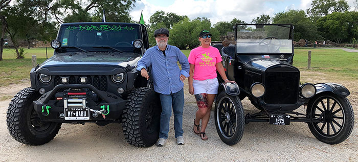 Hugh Hemphill and Therese Fleming in their 1925 Ford Model T touring car at a San Antonio T club gathering, December 2017