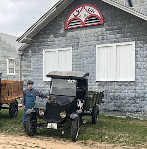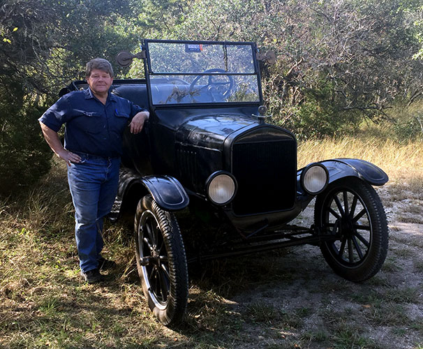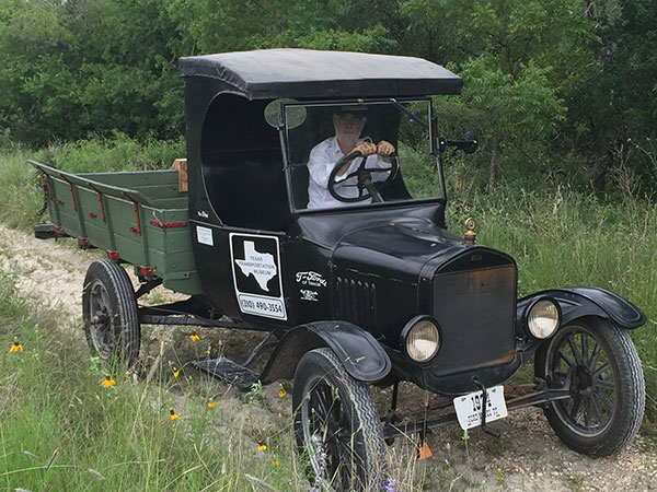 Hugh Hemphill with the 1924 Ford Model TT belonging to the Texas Transportation Museum during the March 2019 Hill Country TT tour