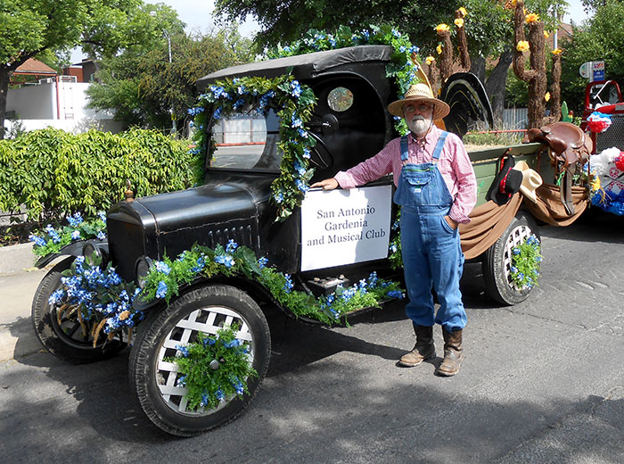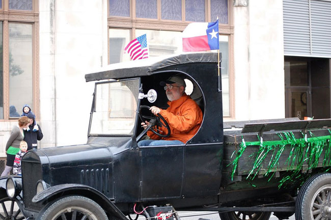 Hugh Hemphill, TFOT Vice-president, with the 1924 Ford Model T C Cab 1 ton truck belonging to the Texas Transportation Museum in a St. Patrick's day parade in San Antonio