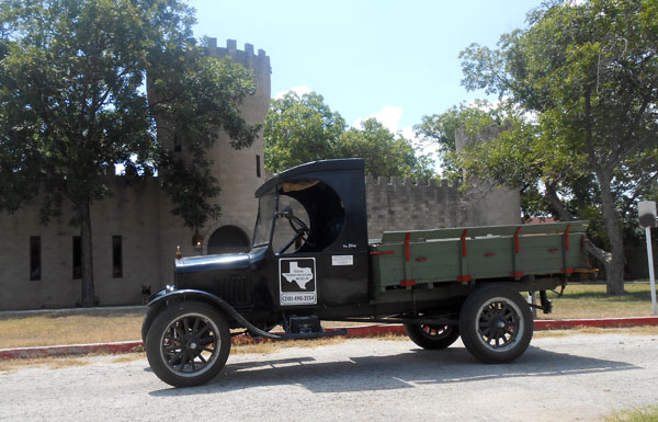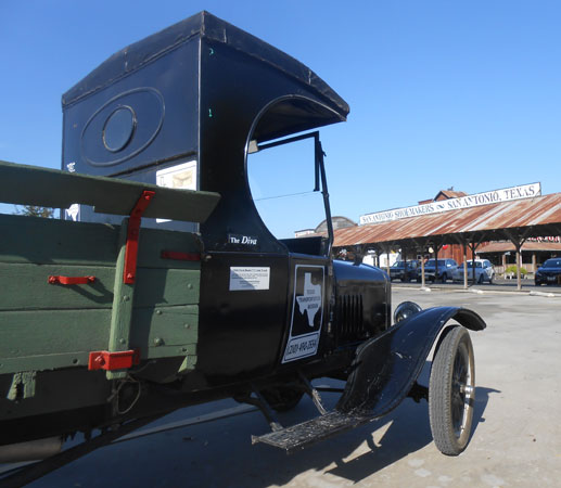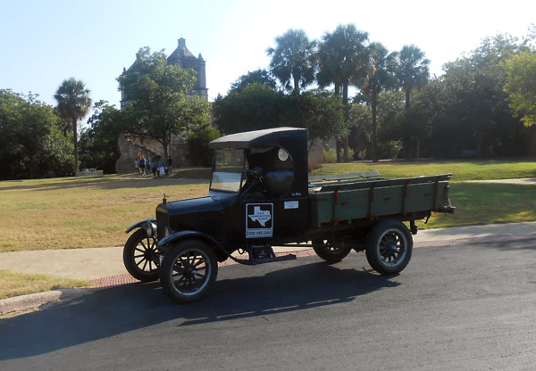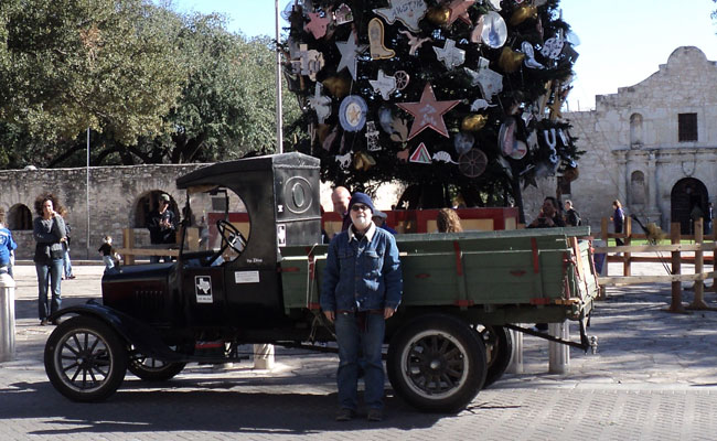 Hugh Hemphill, TFOT Vice-president, at the Alamo in the 1924 Ford Model T C Cab 1 ton truck belonging to the Texas Transportation Museum