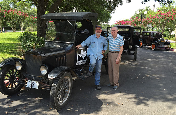 Hugh Hemphill with Broderick Thompson of Houston, who was kind enough to give Hugh a ride in his 1925 Ford Model T during the 2015 Texas T party based in Uvalde