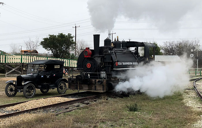 Hugh Hemphill's 1925 Ford Model T touring car with a 1925 steam locomotive at the Texas Transportation Museum, February 2018