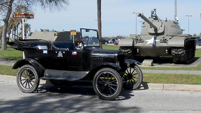 Hugh Hemphill's 1925 Ford Model T with a tank at Fort Sam Houston, March 2018