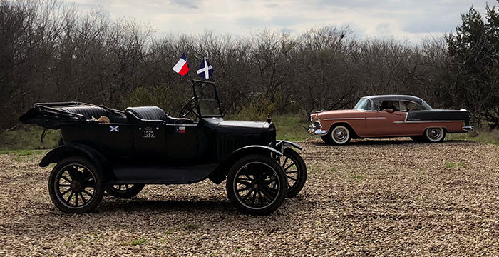 Hugh Hemphill's 1925 Ford Model T touring car with a 1955 Chevy at the Texas Transportation Museum, March 2018