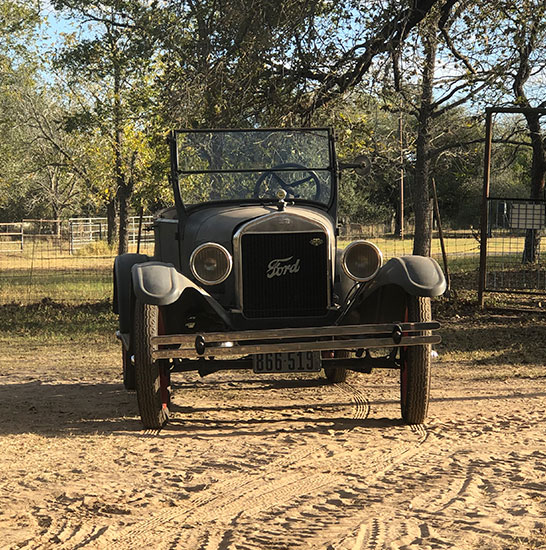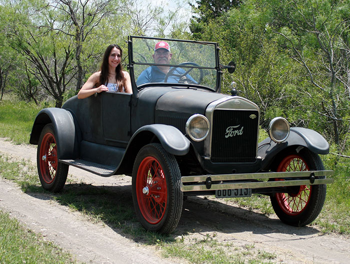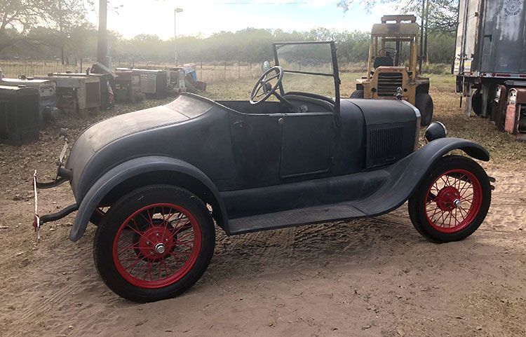 Jay Korus spent decades as a welder in the Texas oil fieldsbefore setting up as a welder and general purpose heacy equipment repairman on some property near Pleasnaton. Among his many interests, Jay was attracted to the ruggesd simplicity of the Ford Model T. While he is painstakingly restoring, almost from scratch, a TT truck, he acquired a fun 1926 runabout hat he enjoys driving around the quiet Atascosa country roads.