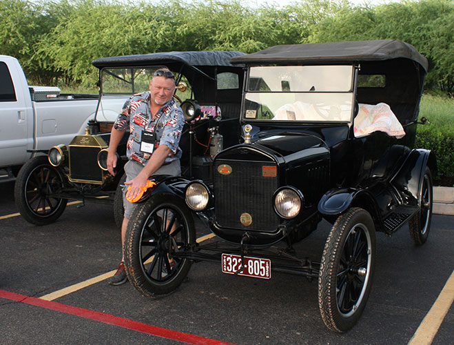 John Olfers spiffing up his newly acquired 1925 Ford Model T touring car during the 2018 Texas T Party