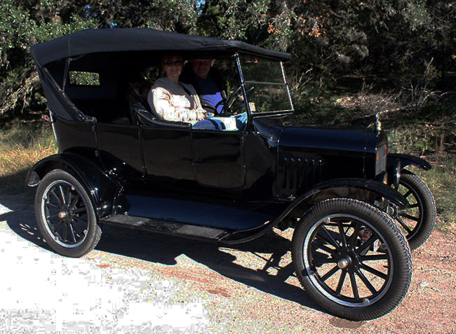 John Olfers and Joni Smith in his 1925 Ford Model T touring car during the March 2019 Hill Country TT tour