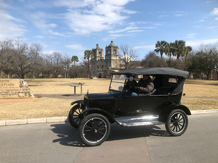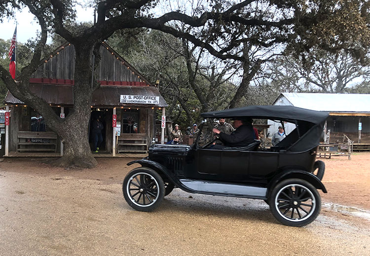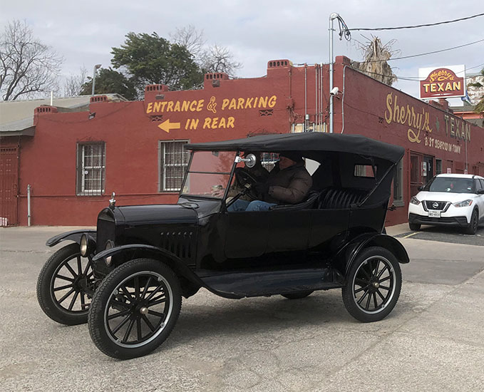 John Olfers in his 1925 Ford Model T touring car in Luckenbach during the Hill Country tour, February 2021
