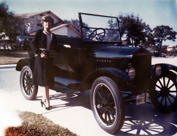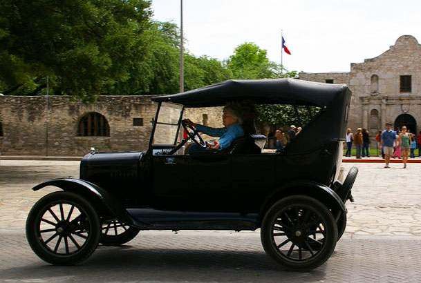June Prade in her 1924 Ford Model T touring car at the Alamo