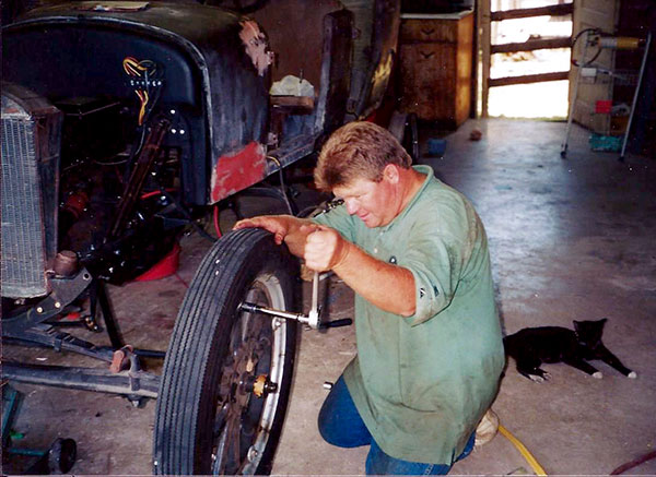 Daniel Bratcher fixing the front wheel on his 1926 Ford Model T touring car