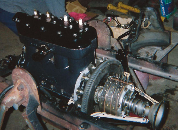 The replacement engine for George Wilson's 1921 Ford Model T Center Door being mated with with the transmission