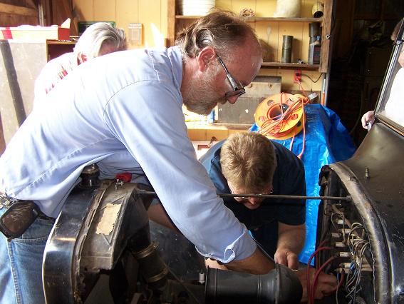 "TFOT" president, in whose "Timeless Ts" shop the work was done, helping with the engine on the 1923 Ford Model T runabout
