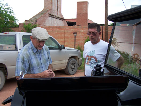 Richard Horvath and Marshall Huling make an engine adjustment on Richard's 1923 Model T roadster at the 2012 Medina County tour