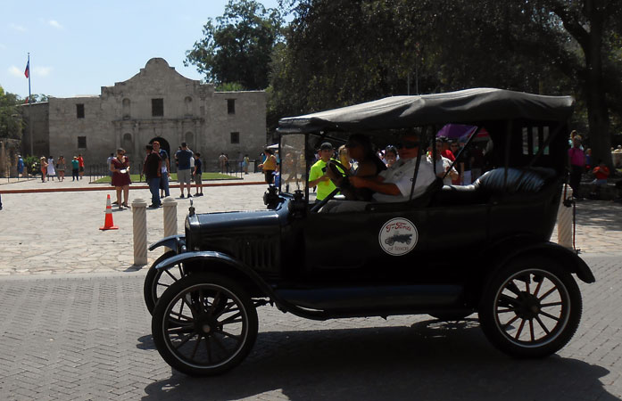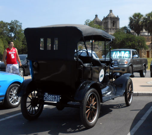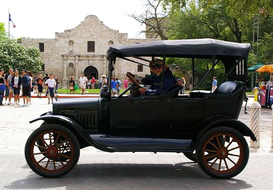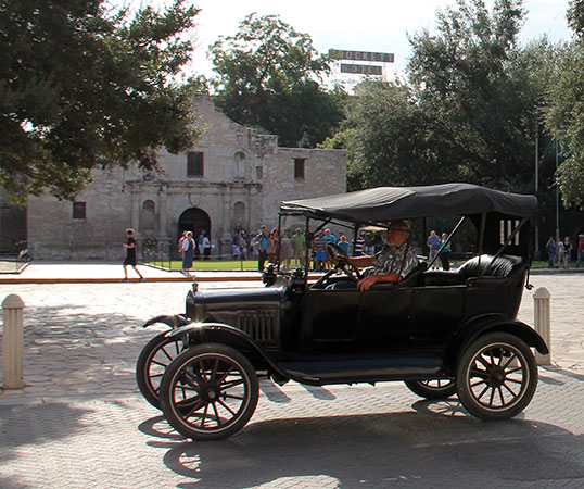 Ronnie Bitterly in his 1917 Ford Model T touring car at the Alamo during the 2015 San Antonio Ford Model T Show