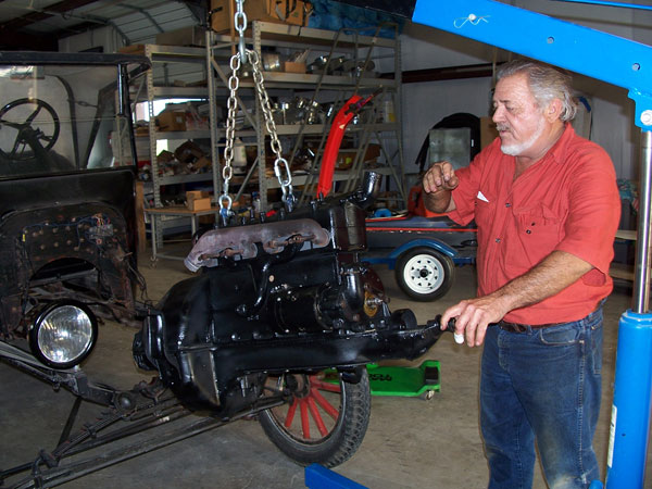 Ronnie Bitterly re-installing the engine on his 1923 Ford Model T runabout