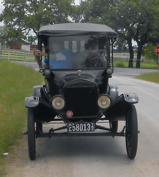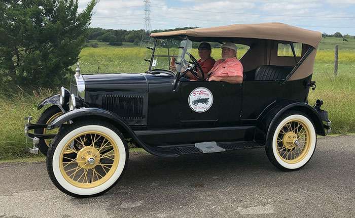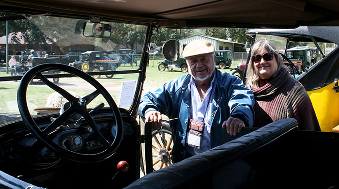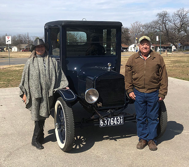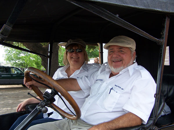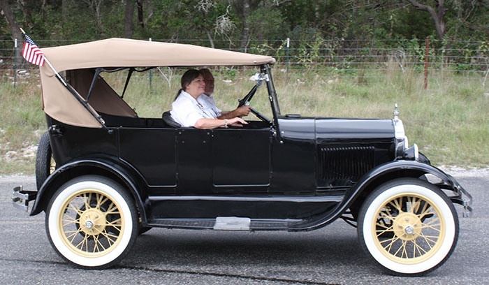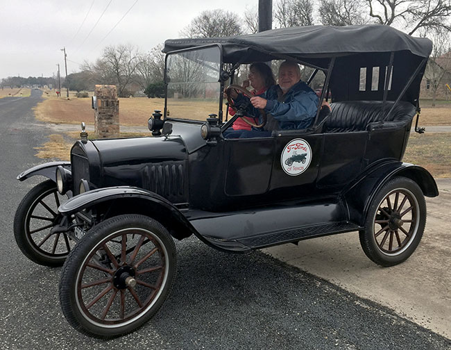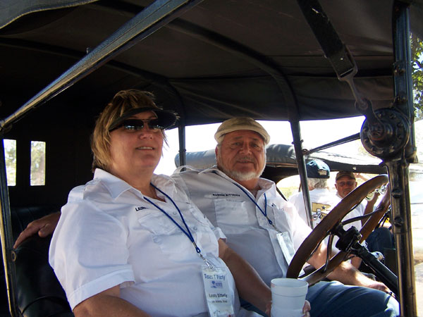 John Olfers and Joni SMith, friends of Ronnie Bitterly in Ronnie's 1917 Ford Model T during the 2017 Texas T Party