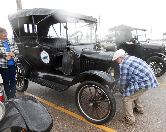 Ronnie and Laura Bitterly in their 1917 Ford Model T touring car in the rain during the 2015 Texas coast tour based in Rockport, November 2015