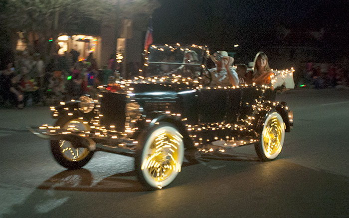 Ronnie and Laura Bitterly with their 1926 Ford Model T touring car on the way to the 2017 Boerne Christmas parade