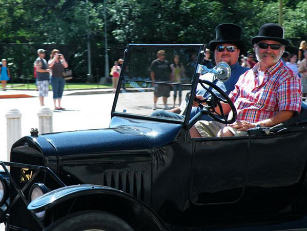 Clint Bitterly and Gary Bethke on Alamo Plaza during the downtown cruise during the annual San Antonio Ford Model T Show