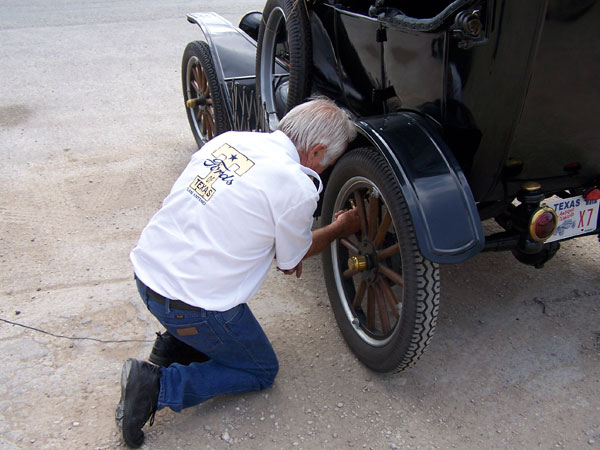 Tom Campbell checking a tire on his 1915 Touring Car during the 2012 TFOT Medina County Tour