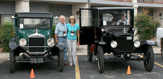 Tom Campbell with Janie Neunhoffer between his 1926 Ford Model T and George Wilson's 1921 during the 2017 Texas T Party