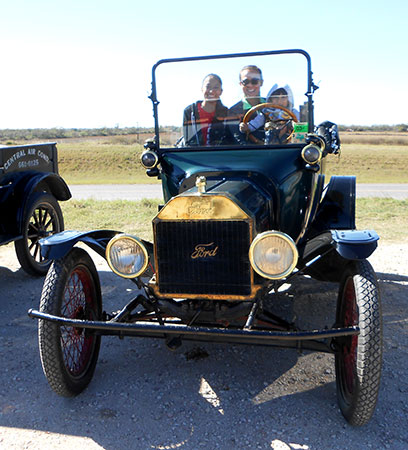 Wayne Johnson giving a ride in his 1915 Ford Model T runabout to a visitor during the 2017 San Antonio Ford Model T Show