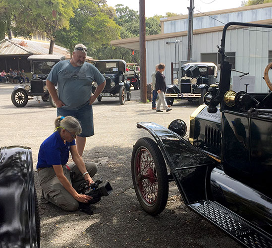 Wayne Johnson watching a TV journalist get a close up of his 1915 Ford Model T runabout during the Bexar County Sheriff's Department "Explorer" program fundraising car show, September 2017