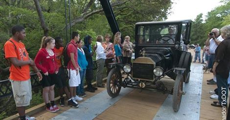 Willie Cordes crossing the Piano Bridge is near the community of Dubina, home to one of the painted churches of Fayette County, in his 1915 Model T Center door. Back In the 80s and 90s Willie and Gay Nell used to lead a weekend tour each spring for Space City Ts and more than once included this bridge on their route. Willie was there on the day they re-opened it in 2015 after being restored and was invited to be the first vehicle to cross.